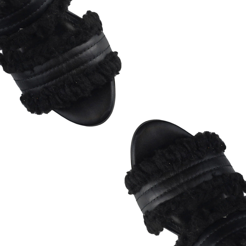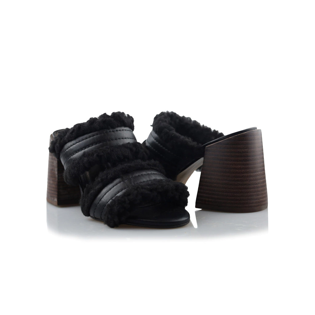 salto bloco com um design contemporâneo e ousado. O modelo possui duas tiras largas, uma em couro preto liso e outra em material peludo, que proporcionam um contraste interessante e texturizado. O salto é robusto, com um acabamento em madeira que adiciona um toque rústico ao calçado. Essa combinação de materiais oferece um visual moderno e confortável, ideal para quem busca estilo sem abrir mão do conforto.