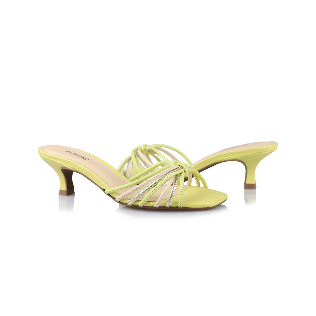 A imagem mostra uma sandália de salto médio em um tom vibrante de amarelo. O design é moderno, com tiras finas que se entrelaçam na parte frontal, criando um efeito visual interessante.