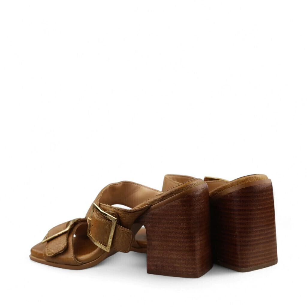DESCRIÇÃO: A imagem mostra uma sandália de salto médio em um tom caramelo. O design é elegante e moderno, com duas faixas largas na parte frontal, uma delas decorada com fivelas grandes em metal dourado que adicionam um toque de sofisticação.
