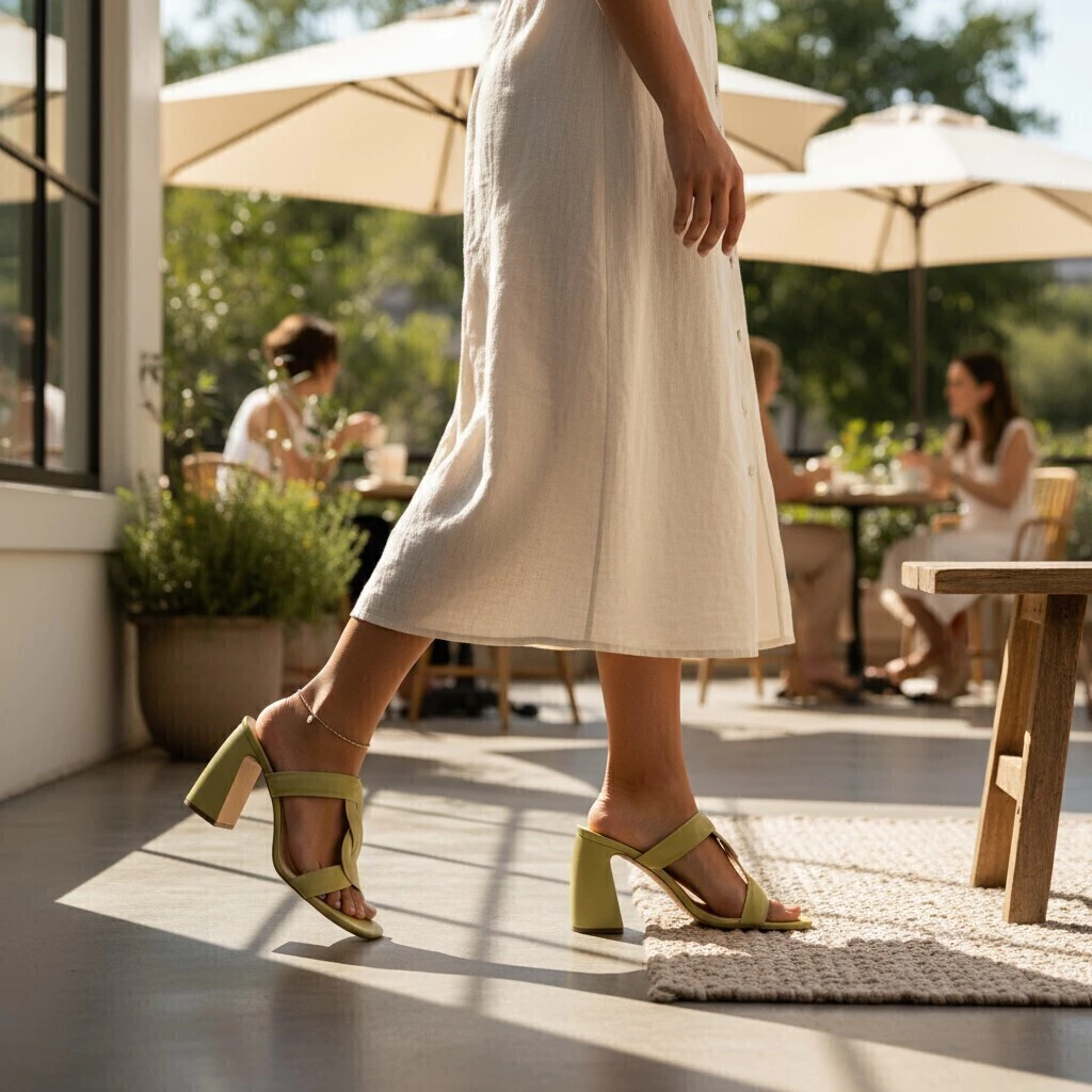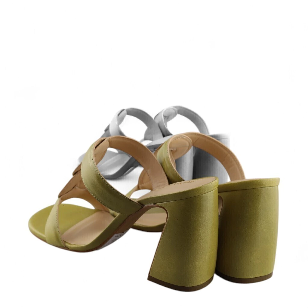 DESCRIÇÃO: A imagem mostra uma sandália feminina em um tom verde oliva suave. O design é elegante e moderno, apresentando uma tira larga que se entrelaça na parte frontal, criando um efeito visual interessante e estiloso. O salto é quadrado e de altura moderada, proporcionando conforto e estabilidade ao caminhar. A sola é lisa, o que adiciona um toque de sofisticação ao modelo. Esta sandália é ideal para ocasiões casuais e semi-formais, sendo uma escolha versátil que pode ser combinada com diferentes looks, trazendo um toque de cor e estilo à produção.