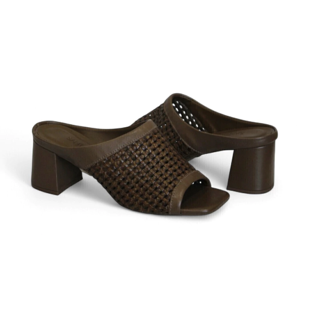 DESCRIÇÃO: Tamanco mule feminino marrom com bico quadrado e abertura frontal (peep-toe). Cabedal largo em tecido/tiras trançadas tipo woven, acabamento em material liso no topo e na borda do bico. Salto bloco médio em tom marrom, palmilha levemente acolchoada. Visual elegante e confortável, ideal para looks casuais e refinados.