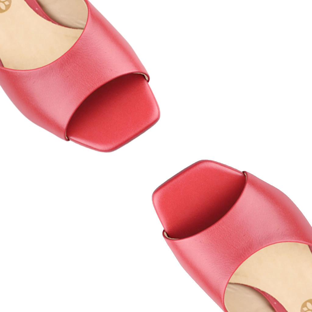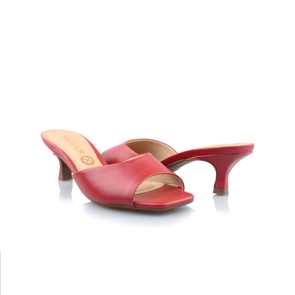 DESCRIÇÃO: A imagem mostra uma sandália de salto na cor vermelha, com um design elegante e moderno. O modelo possui uma abertura na frente, permitindo que os dedos fiquem à mostra, e um detalhe de corte em V na parte superior, conferindo um toque estiloso. O salto é levemente elevado, oferecendo uma altura confortável que combina bem com diversos looks. A parte interna é acolchoada, proporcionando um bom ajuste ao pé. Essa sandália é ideal para ocasiões sociais e eventos noturnos, adicionando um toque de cor e sofisticação a qualquer visual.