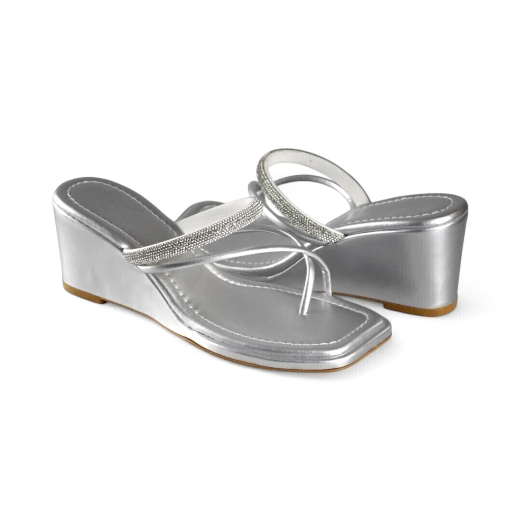 DESCRIÇÃO: Essa sandália prateada combina elegância e conforto em um design contemporâneo. O modelo apresenta tiras finas e delicadas, sendo uma delas adornada com aplicações de brilho que adicionam um toque sofisticado. O salto anabela médio oferece estabilidade e estilo, ideal para quem busca um visual refinado sem abrir mão do conforto. Perfeita para compor looks festivos, casuais chiques ou produções noturnas com um toque de glamour.