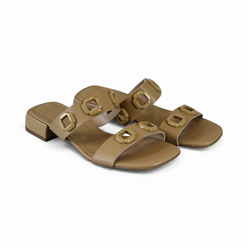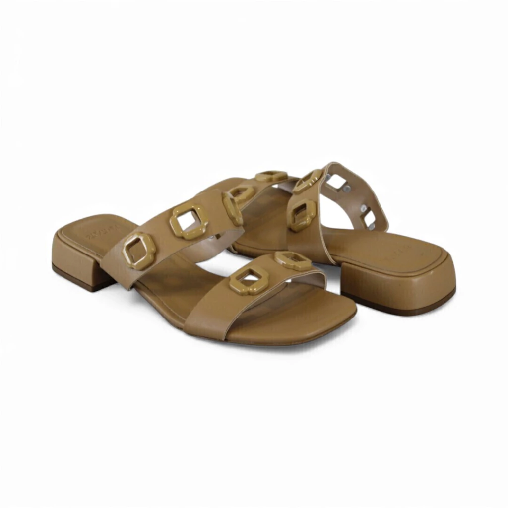 DESCRIÇÃO: Tamanco bege/caramelo, modelo slide com duas tiras sobre o peito do pé. Cada tira traz aplicações geométricas esmaltadas no mesmo tom, tipo quadrado com recorte central. Bico aberto e levemente quadrado, palmilha no mesmo tom e salto bloco baixo retangular revestido. Acabamento liso e visual contemporâneo.