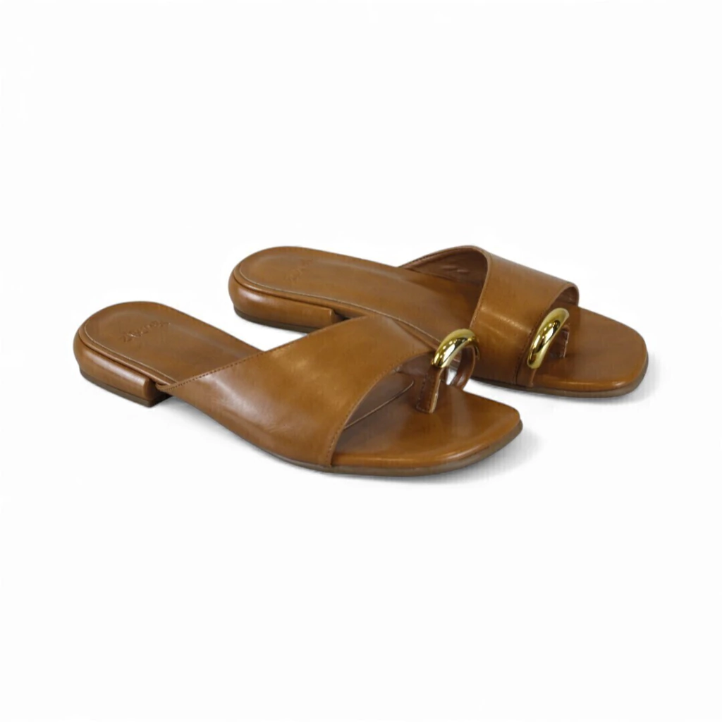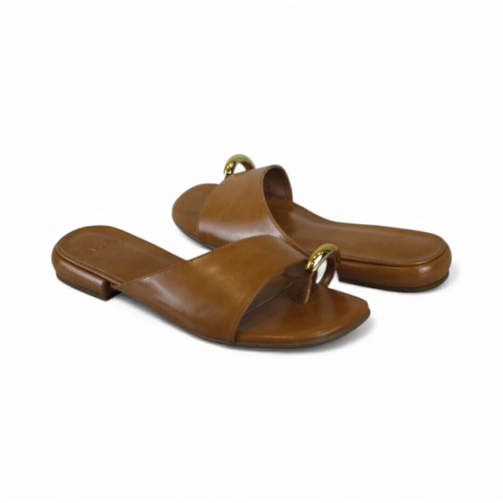 DESCRIÇÃO: Tamanco em tom caramelo/marrom claro com acabamento liso (aparência couro). Modelo slide com tira larga cruzando o peito do pé e detalhe de tira tipo “dedo” com argola dourada metálica na parte frontal. Bico aberto levemente quadrado/arredondado, palmilha e contorno no mesmo tom, salto bloco muito baixo e quadrado. Visual minimalista e elegante com toque metálico.