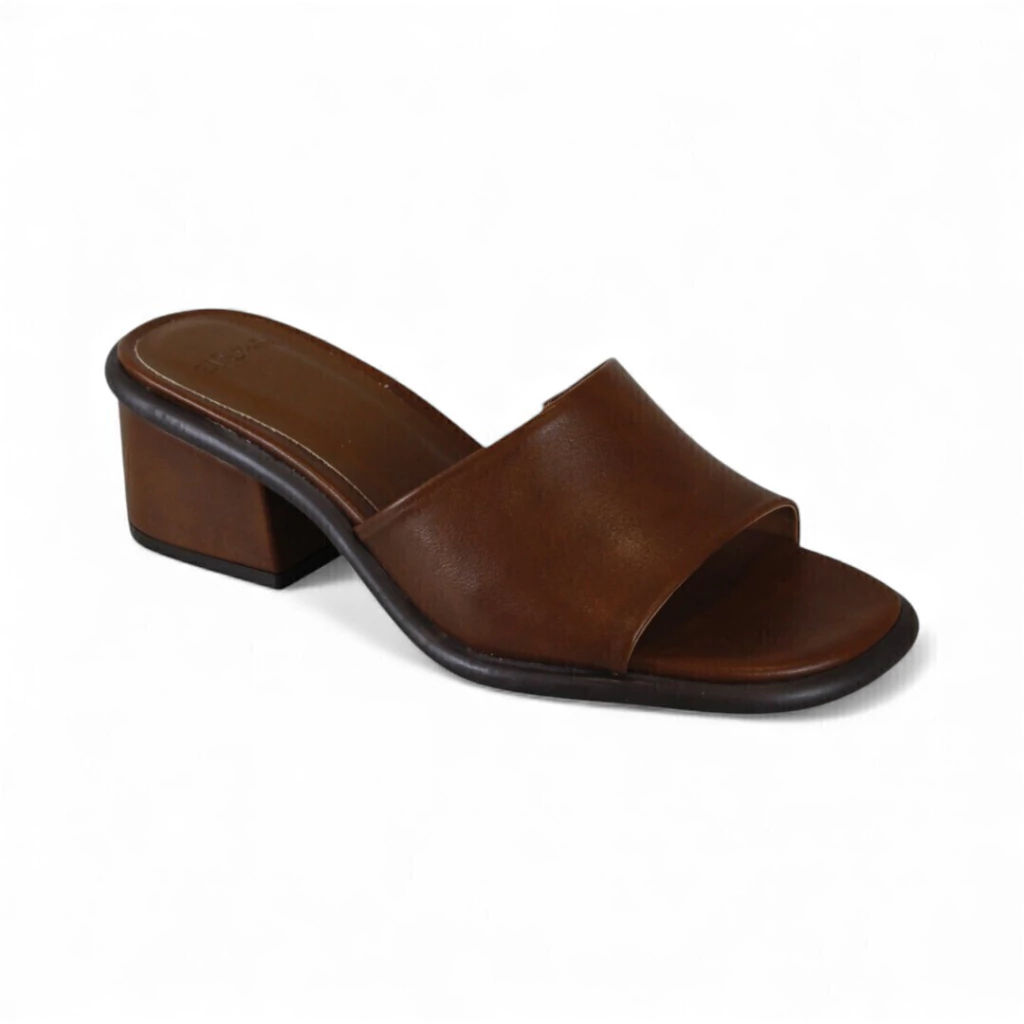 DESCRIÇÃO: Tamanco feminino marrom em material com acabamento liso (aparência couro), estilo slip-on sem fechamento. Cabedal com uma tira larga cobrindo o peito do pé, bico aberto levemente arredondado/quadrado. Palmilha no mesmo tom marrom com filete costurado, sola com contorno escuro e salto bloco baixo e quadrado. Visual clássico e minimalista.