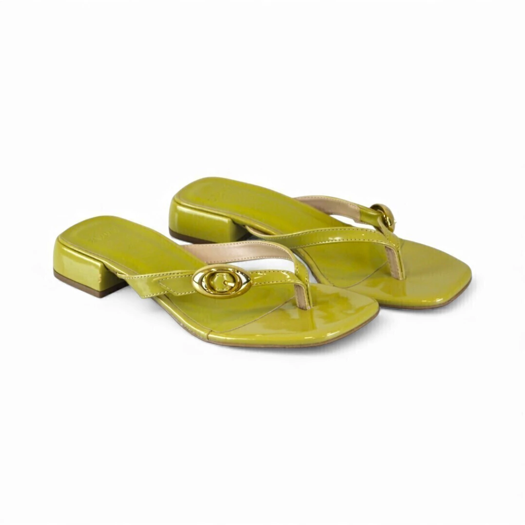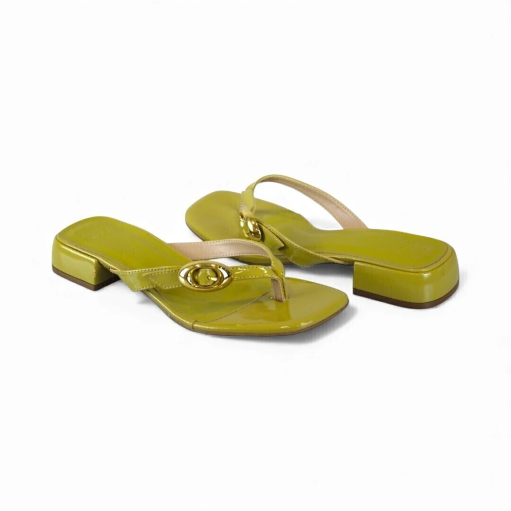 DESCRIÇÃO: Tamanco em verniz verde-oliva/mostarda com acabamento brilhante. Tira em Y (modelo dedo) com aplicação metálica oval/dobrada dourada na parte superior. Bico levemente quadrado/arredondado, palmilha no mesmo tom brilhante e salto bloco baixo retangular revestido na mesma cor. Visual moderno e chamativo.
