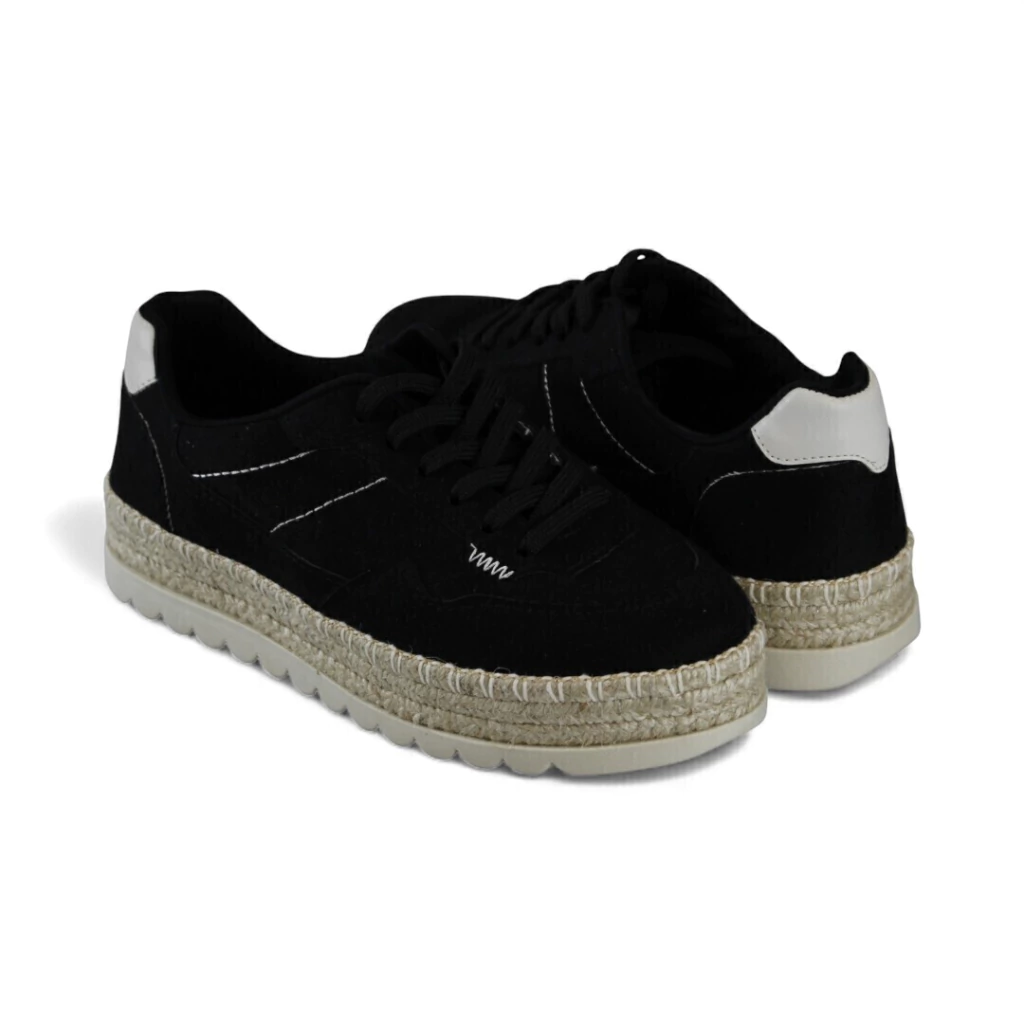 DESCRIÇÃO: Tênis casual preto com cadarços na mesma cor e pala em material tipo camurça. Detalhes de costura branca decorativa nas laterais e um pequeno bordado branco próximo à amarração. Contraforte com patch branco no calcanhar. Entressola em estilo espadrille com corda tipo juta trançada e sola de borracha clara serrilhada. Estilo urbano, feminino.